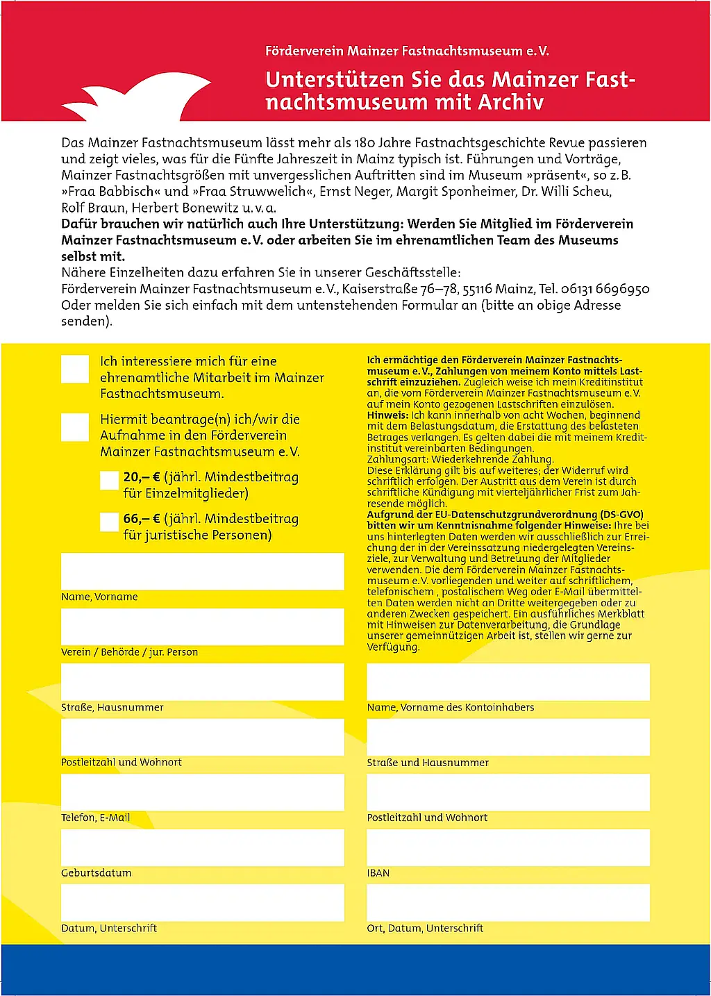 Dafür brauchen wir natürlich auch Ihre Unterstützung: Werden Sie Mitglied im Förderverein Mainzer Fastnachtsmuseum e. V. oder arbeiten Sie im ehrenamtlichen Team des Museums mit.
