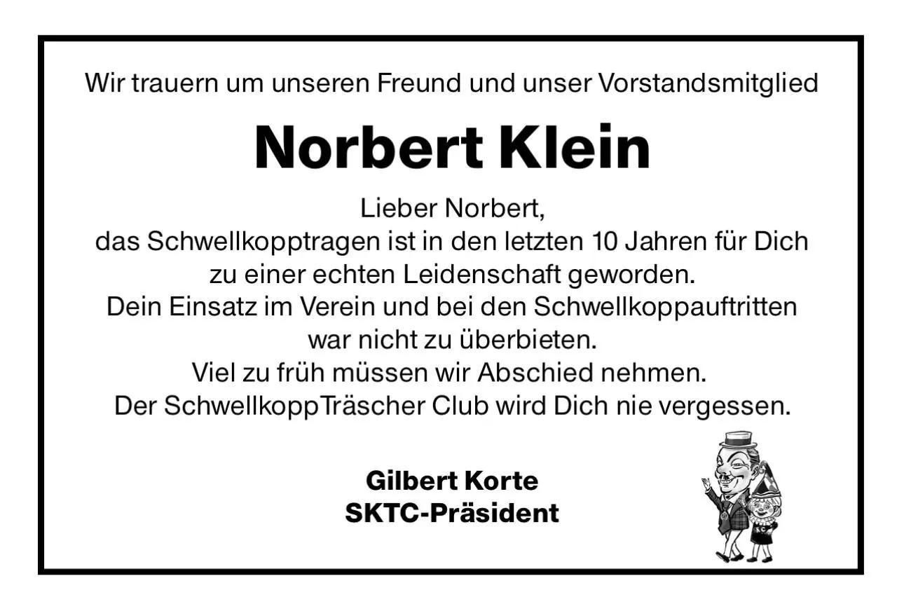Wir verlieren mit Norbert einen Kameraden, einen Freund und einen Menschen, der stets bereit war, Verantwortung zu übernehmen und die Tradition unseres Clubs weiterzutragen. Sein Humor, seine Hilfsbereitschaft und seine Treue werden uns fehlen. Der Schwellkopp wird weiter durch die Straßen getragen – doch Norberts Platz bleibt leer.