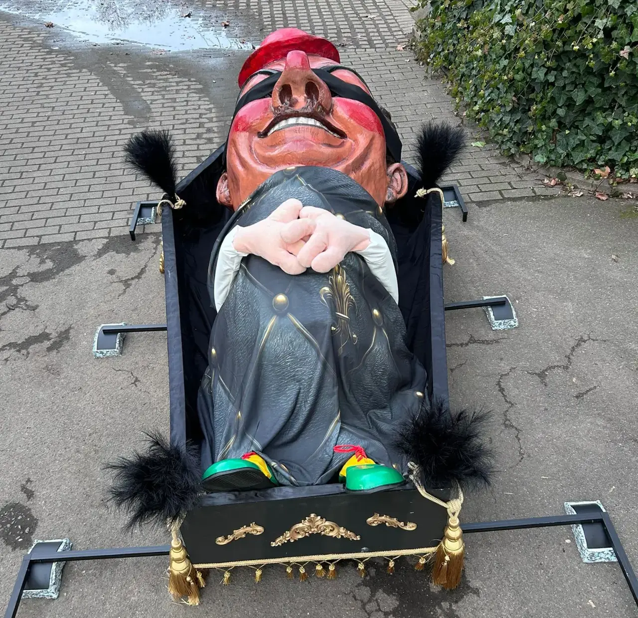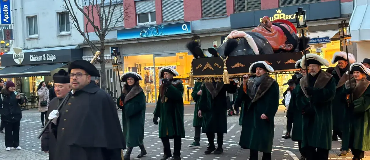 Dann begann die Liturgie, so schräg, dass selbst fromme Leit kurz irritiert gugge. Gesänge, die eher nach Kneipenchor klangen, Gebete, die zwischen Wehklage und Witz pendelten, un e Pfarrer, der den Hannebambel als „schwer an Charakter un noch schwerer an Gewicht“ beschrieb. Die Klageweiber schnieften dramatisch, manche vielleicht e bissje übertriebe, aber - es is ja Fastnacht, da darf’s e Nummer größer sein.