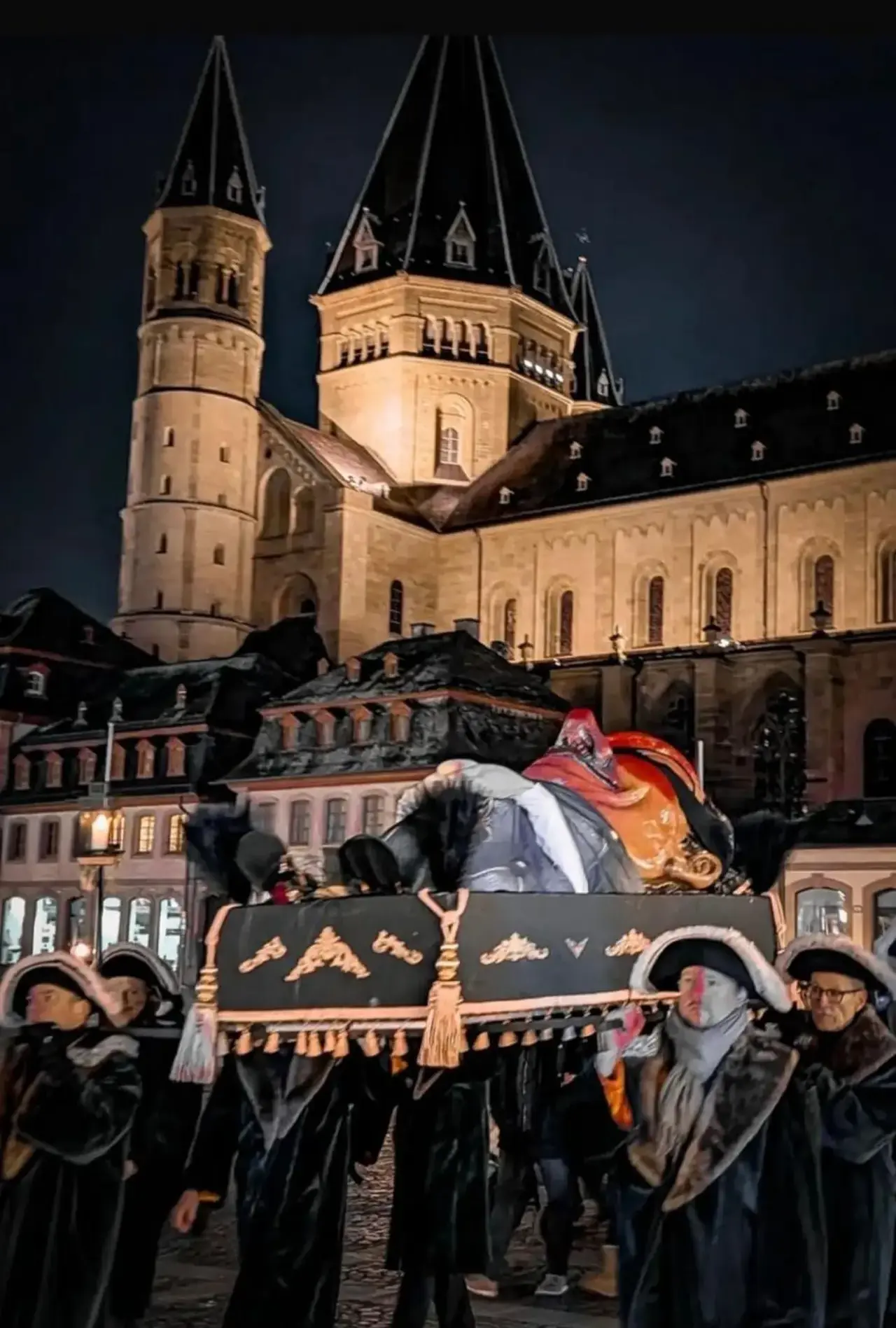 Am Schillerplatz, direkt am Fastnachtsbrunne, versammelte sich die Trauergemeinde. Rund 300 Leit, alle in dunkle Kleider, als wär’s e Staatsbegräbnis. Nur dass hier halt en Schwellkopp im Sarg lag – unser „Hannebambel“, e Meenzer Original, das mehr Geschichten erlebt hat als die halb Altstadt zusamme. Die Garde der Prinzessin hatte die Tradition wieder ausgegrabe, weil se net wollt, dass der Aschermittwoch so sang- und klanglos verschwind wie en leere Schobbe nachm Umzug.